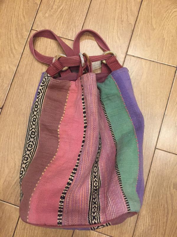 Сумка-рюкзак крепкий, цвета выгоревшие и деревянные ручки лак стертый