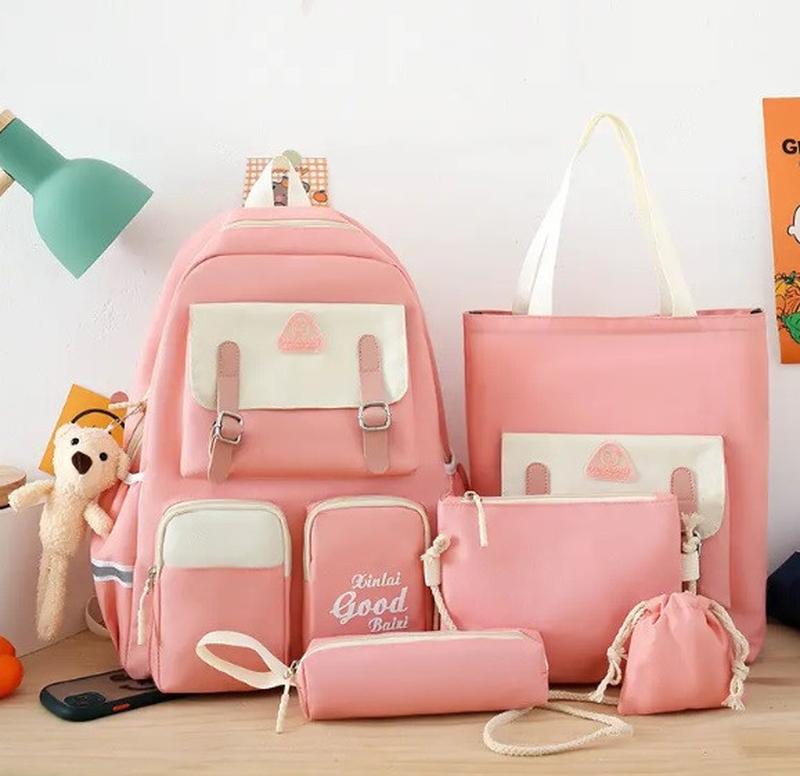 Женский рюкзак комплект 5 в 1 имеет несколько особенностей: - В середине рюкзака есть одно отделение, разделенное на две части. Это позволяет удобно организовать и разделить вещи. - На передней части рюкзака есть карманы. Это предоставляет дополнительное пространство для хранения и легкий доступ к мелочам. - Рюкзак поставляется в комплекте с брелоком мишкой и значками. Это милые аксессуары, которые придают рюкзаку уникальный стиль. - Материал рюкзака изготовлен из полиэстера. Полиэстер обладает хорошей прочностью и устойчивостью к износу, что делает рюкзак долговечным. Размеры этого рюкзака: - Высота: 45 см - Ширина: 32 см - Глубина: 14 см Этот рюкзак предлагает практичное использование с удобным внутренним разделением, дополнительными карманами для организации вещей, а также поставляется вместе с аксессуарами для добавления стиля.