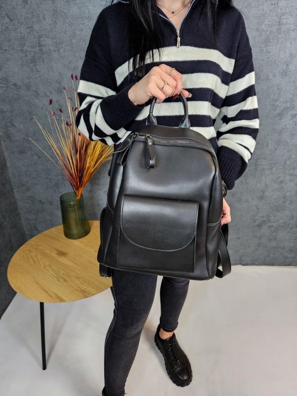 Рюкзак в черном цвете Невероятно мягкое и содержимое Идеально подойдет на учебу, тренировки и прогулки) ✔️Изготовлен из эко - кожи ✔️Закрывается на молнию ✔️Одно большое отделение ✔️Внутри находится двойной открытый карман и карман на молнии. ↖️Размеры - 32×28х13 см
