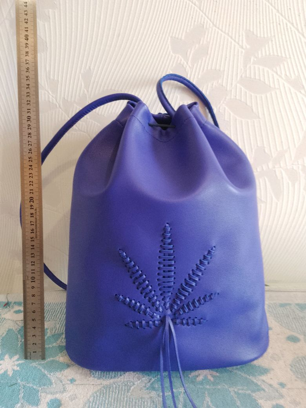 Виробник: Українське Handmade, натуральна шкіра, кнопка на дні дозволяє фіксувати шлею і носити, як рюкзак. Сумка носиться, як в затягнутому, так і в розпущеному вигляді, ширина у нижній частині 24 см, висота 33 см. Шлея регулюється звичайним вузлом. Ціна 2700 грн.