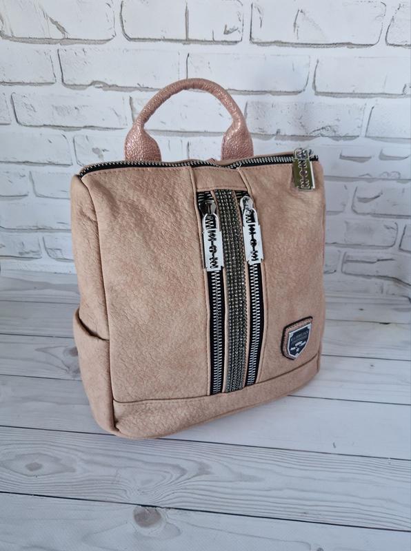 Оригинальная сумка-рюкзак оригинальная. Небольшой и вместительный с широким. Материал - экокожа. Высота ручки - 10 см. и две регулируемые лямки рюкзака на спине. Сумка закрывается на широкую металлическую молнию с декоративным бегунком в форме лезвия. На лицевой стороне сумка украшена двумя вертикальными молниями с бегунками в форме лезвий и пришита аппликация с металлическими стразами. . Вдоль боков расположены два вшивных кармана. На задней стороне есть вертикальный прорезной карман на молнии. Внутри - тканевая подкладка, одно большое отделение. С одной стороны - горизонтальный прорезной карман на молнии, с другой стороны - карман для документов. Размеры:25*26*12 Цвета-белый, беж, бронза и пудра