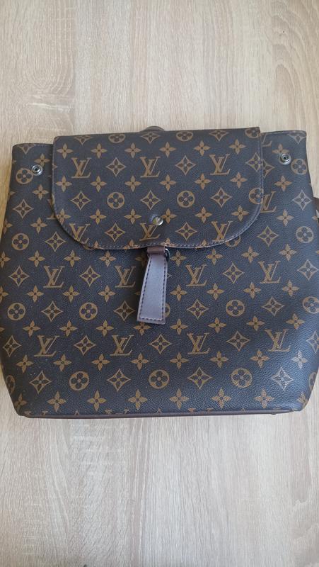 Рюкзак в кольористиці під Луис Вітон коричневого кольору з шкірозамінника, має одне відділення, та дві кишені на блискавці зовні та у середині. На металевих ніжках. Закривається на кнопку, та блискавку. Розміри 34*31*11 см. Має коротку ручку, дві довги ручки, які можно трансформуватися в одному довгу.