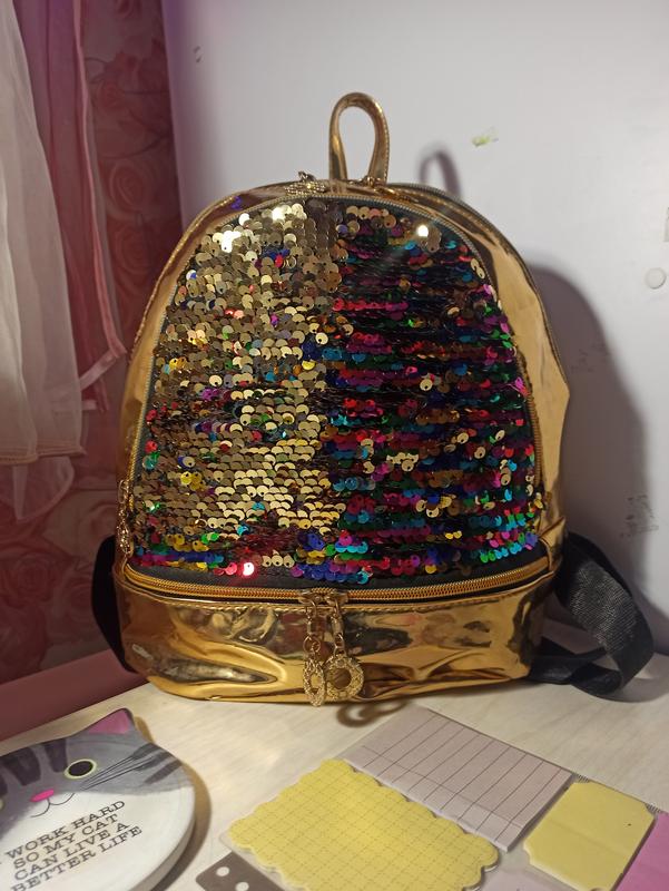 Яркий, легкий, удобные отделы, вместительный, пайетки поворачиваются разным цветом.Все кармашки закрываются. Замеры по запросу.