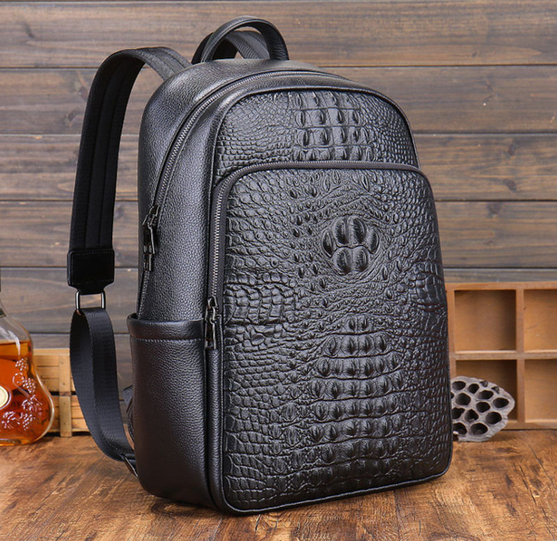 Большой мужской кожаный рюкзак с тиснением рептилия крокодил черный