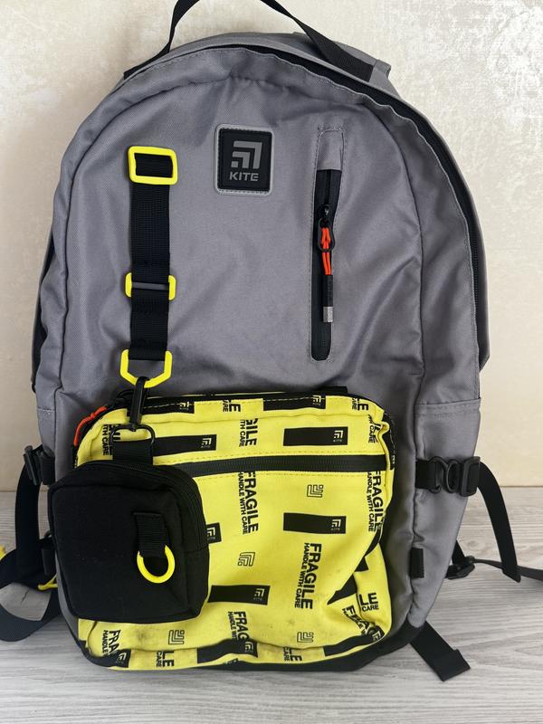 Рюкзак kite в гарному стані. На 2 відділення всередині. Додатково на жовтій сумочці також 2 відділення на замку, чорна маленька сумочка на замку, на сірій частині рюкзака також відділення маленьке на замку. З лівого та правого боку рюкзака є місце для води (пляшка фіксується 2 затяжками з кожної сторони). Жовта частина рюкзака не знімна, тому трохи забруднена (на фото вказано). Можливо, можна відмити (я не терла нічим).