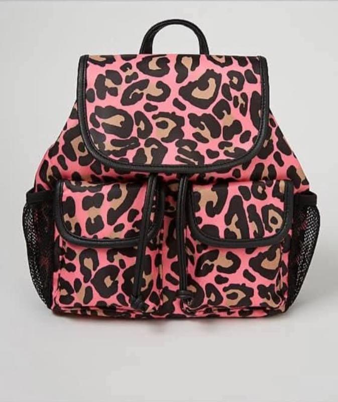 Стильный рюкзак George с ярким леопардовым принтом на розовом фоне. Имеет основное отделение на завязках, клапан на застежке и несколько удобных внешних карманов. В отличном состоянии.