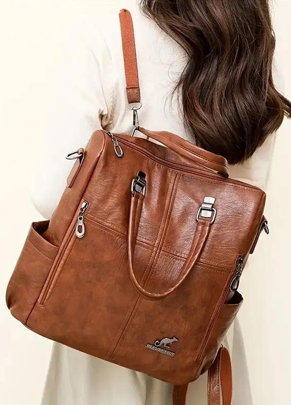 Сумка выполнена из экокожи. Можно также носить как рюкзак на спине. Ширина по дну 30см, высота 34 см, глубина 12см. Достаточно вместительная, подходит для документов формата А4. Аксессуар выполнен из экокожи, имеет одно основное отделение на молнии. В основном отделении есть карман на молнии и один открытый карман. На задней части рюкзака, есть еще один карман на молнии. На лицевой стороне два не глубоких кармана на молнии.по бокам два открытых кармана.