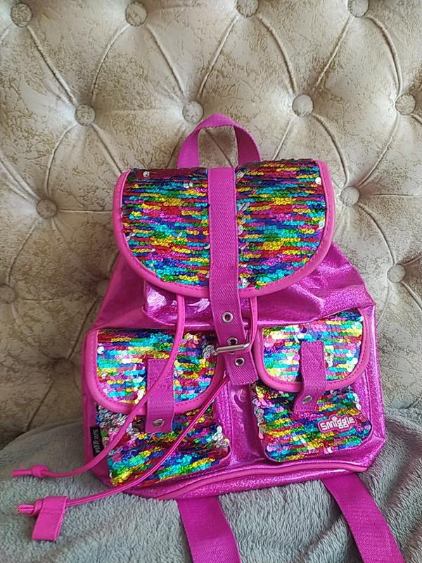 Стильный, яркий, качественный фирменный рюкзак Австрионского бренда Smiggle, который не оставит вашу модницу без внимания. Защелкивается на кнопку-магнит и завязывается на завязки. Вместительный, имеет потайной карман. Также присутствуют два кармана спереди, украшенных пайетками, которые красиво переливаются на свету. Регулируется. Стан замечательный👍😘 Высота - 33 см Ширина - 34 см Товщина дна - 13 см