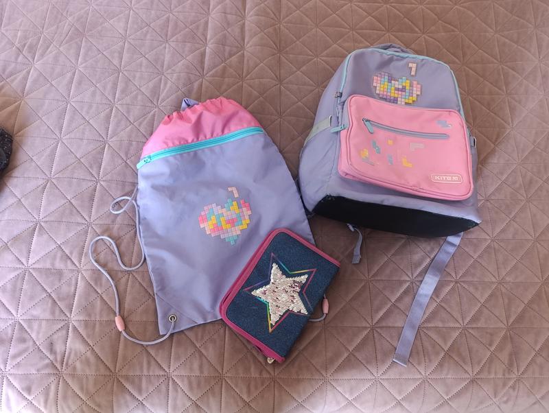 Рюкзак с ортопедической спинкой. Размеры 38*27*13 мм, 14 литров объем. Очень много карманов как извне, так и внутри. Есть следы ношения, видны на фото. все замочки работают. Цвет не выгорал. В рюкзак в подарок пенал и сумочка на передвижное ( почти новое).