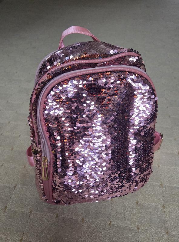 Новый рюкзачок для девочек, вместительный, пайетки розовые/золотистые. высота 28, днище 23/11. Два отделения, два боковых кармашка.