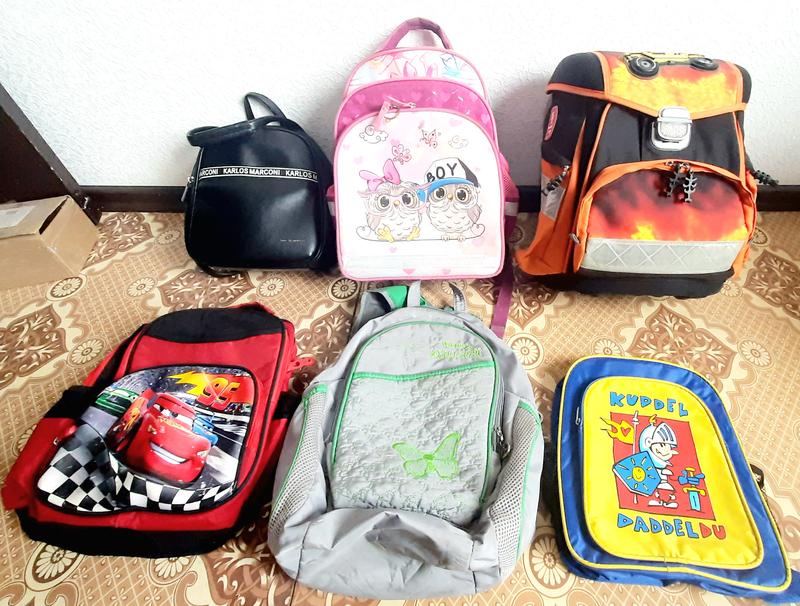 Первый слева рюкзак черный Карлос Маркони оригинал стан на фото цена 200 грн. Есть небольшие потертости на рукоятке. Второй рюкзак розовый с птичками 150 грн. Состояние на фото все работает. Третий рюкзак Каркасная марки Step by step, оригинал стан на фото цена 800 грн. Четвертый рюкзак Тачки красный стан на фото цена 200 грн.. Пятый рюкзак залечен 120 грн. Недостатки на фото. Шестой рюкзак синий из Германии оригинал стана идеальный 150 грн.