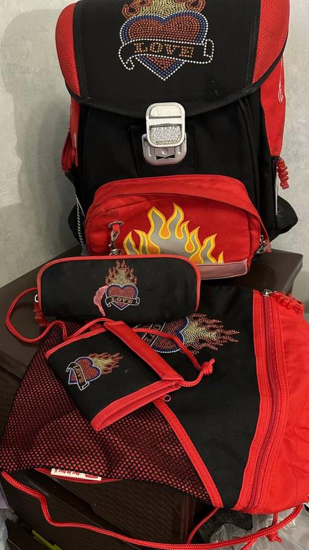 Стильний та зручний шкільний ранець із повним набором аксесуарів. 🔸 Ергономіка: ортопедична спинка та регульовані лямки забезпечують правильний розподіл навантаження та комфорт упродовж усього дня. 🔸 Дизайн: яскраве поєднання червоного та чорного кольорів, декор у вигляді палаючого серця з написом LOVE та вогняних елементів. 🔸 Комплектація: ранець, пенал, сумка для взуття та гаманець у єдиному дизайні. 🔸 Призначення: ідеальний для школярів молодших класів, особливо для першачків. 🎒 Якісний, практичний і дуже стильний – зробить навчання яскравішим і зручним.