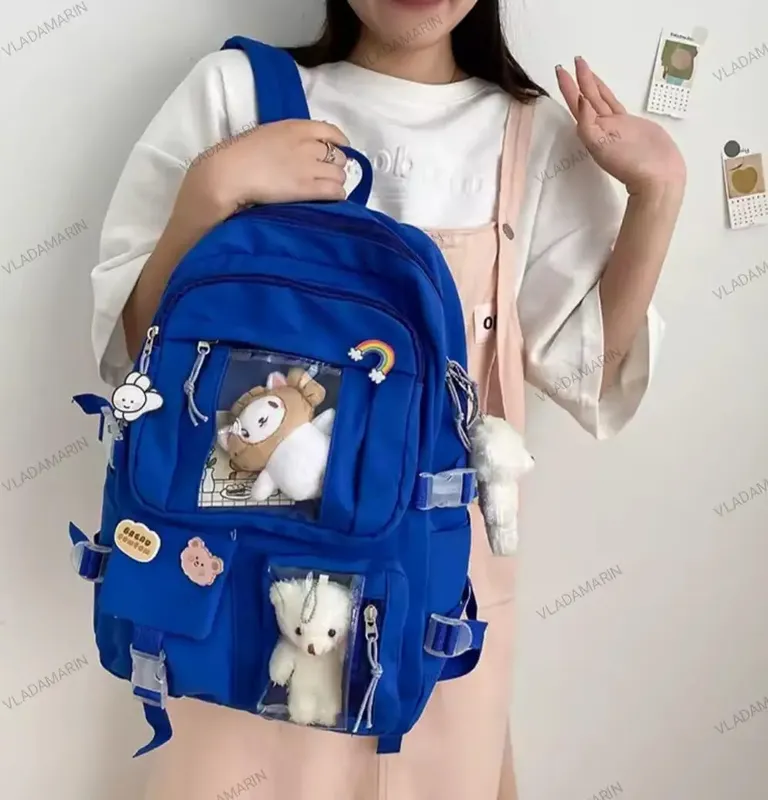 Школьный рюкзак для студентов и подростков в стиле Kawaii Описание: • Стильный синий цвет. • Украшен подвесками, значками и плюшевым мишкой в прозрачном карманчике. • Материал: качественный водонепроницаемый текстиль. Особенности: • Просторный рюкзак со многими отделениями и карманами. • Имеет прозрачный карман для игрушки и дополнительные украшения. • Боковые карманы для бутылочки, или зонта. • Идеально подходит для школы, прогулок или поездок. • Удобные регулируемые лямки. Размер: • Ориентировочно 41 х 30 х 13 см. Быстро отправим!