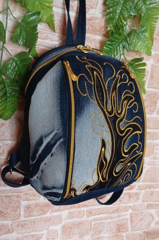 Очень красивый рюкзак из джинсовой ткани, да еще и очень удачной модели.Небольшой, вместительный. Размер 32см на 25см,дно 14см.Обние-большой карман на двух молниях, внутрь-карман на молнии. Спинка укреплена изолоном.Люмки регулируются. Хорошо держит форму,на фото пустой.Косметичка в подарок.