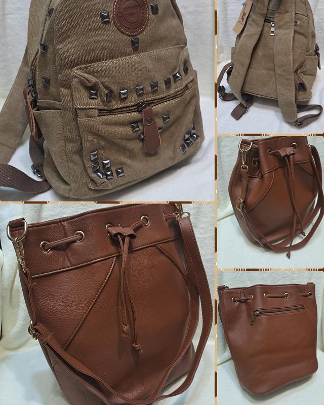 Джинсовый стильный рюкзачок бежевого цвета,на одно отделение. -внутри два рабочих карманчика(открытый и на молнии. - спереди и сзади рабочие карманчики на молнии. -шлейки можно регулировать. Замеры рюкзака:ширина:25см высота:28см,дно:12см. Шоппер насыщенного коричневого цвета. -одное отделение (три рабочих карманчика-на молнии, и два небольших открытых. -длинный классический регулирующий ремешок. По желанию сумка стягивается и закрывается с помощью шнурка. Замеры:ширина:33см,высота:29см. дно:13см.