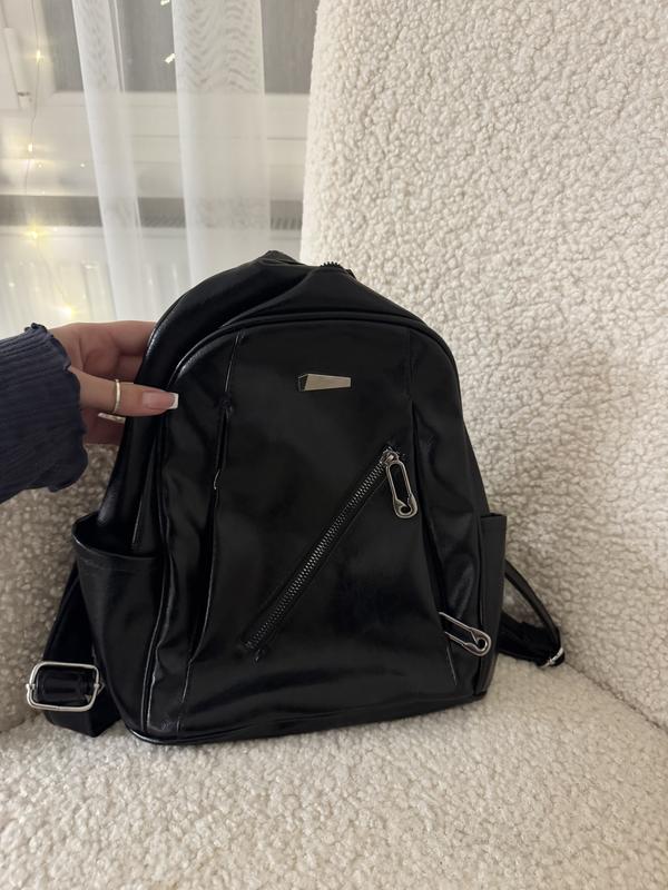 Рюкзак чорного кольору, лакований, невеликого розміру, має багато карманів, має бокові кармани, в гарному стані, шлейки регулюються по довжині