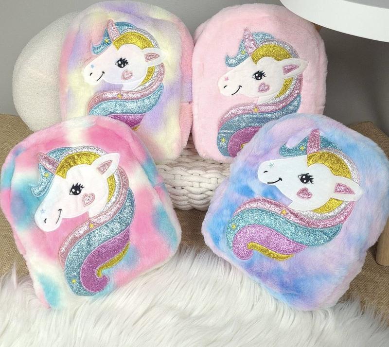 Плюшевий рюкзачок Мають одне відділення, на zip замочку Легкі та зручні для щоденних прогулянок Ідеально підійдуть для садочка, прогулянок або як аксесуар для образу Чотири варіанти кольорів Розміри: 26 × 20 × 10 см Склад: поліестер Комплектація: без брелка на zip
