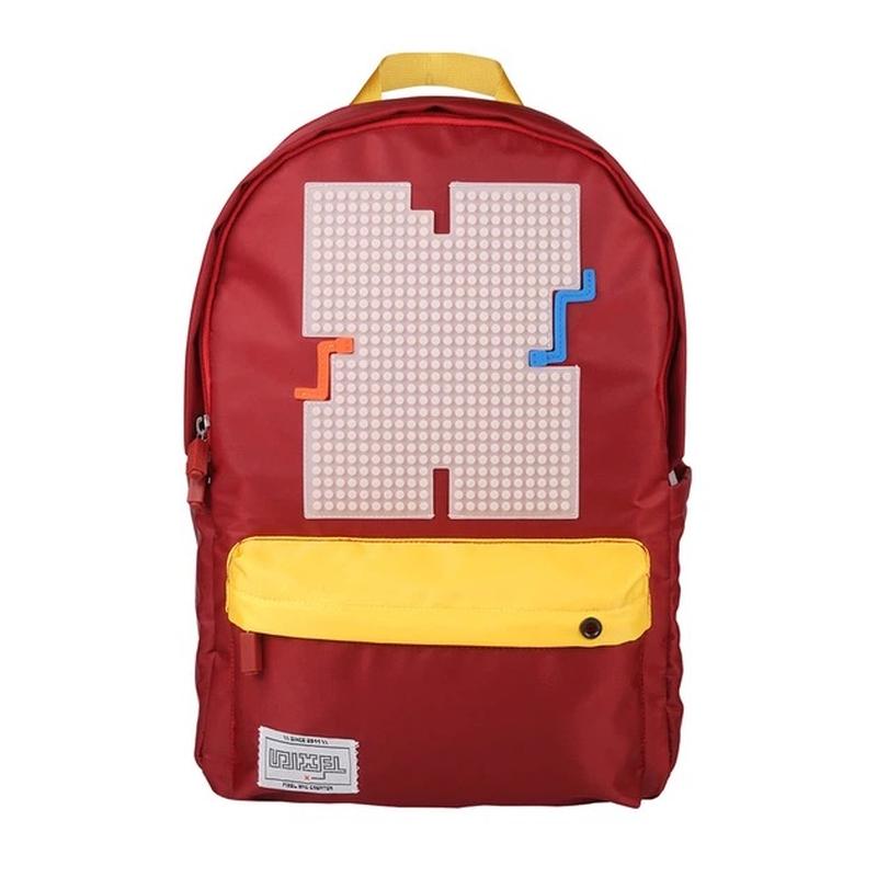 Дизайн: Рюкзак має основний бордовий колір із яскравою жовтою кишенею на блискавці спереду. На передній частині розташована біла піксельна панель, що дозволяє створювати власні візерунки за допомогою кольорових пікселів (на зображенні видно сині та помаранчеві елементи). Матеріали та функції: Виготовлений із міцного водовідштовхувального нейлону. Він має ущільнене дно, м'які ручки та анатомічну спинку, яка підтримує поставу. Призначення: Лямки рюкзака регулюються індивідуально під зріст, що підходить для дітей та підлітків. Використання піксельної панелі розвиває уважність, дрібну моторику та творчі здібності.