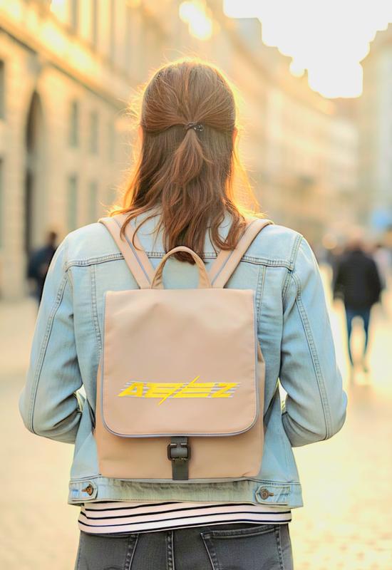 рюкзак ATEEZ, бежевого цвета, с клапаном на котором выполнена надпись акрилом, рюкзак отделенный серой окантовкой, закрывается клапаном с магнитной кнопкой и в середине затягивается на шнур с фиксатором, размер высота 28 см, ширина 23 см. рюкзак выполнен с качественного материала пластинка софтшелл, в середине серая подкладка с абстрактным рисунком