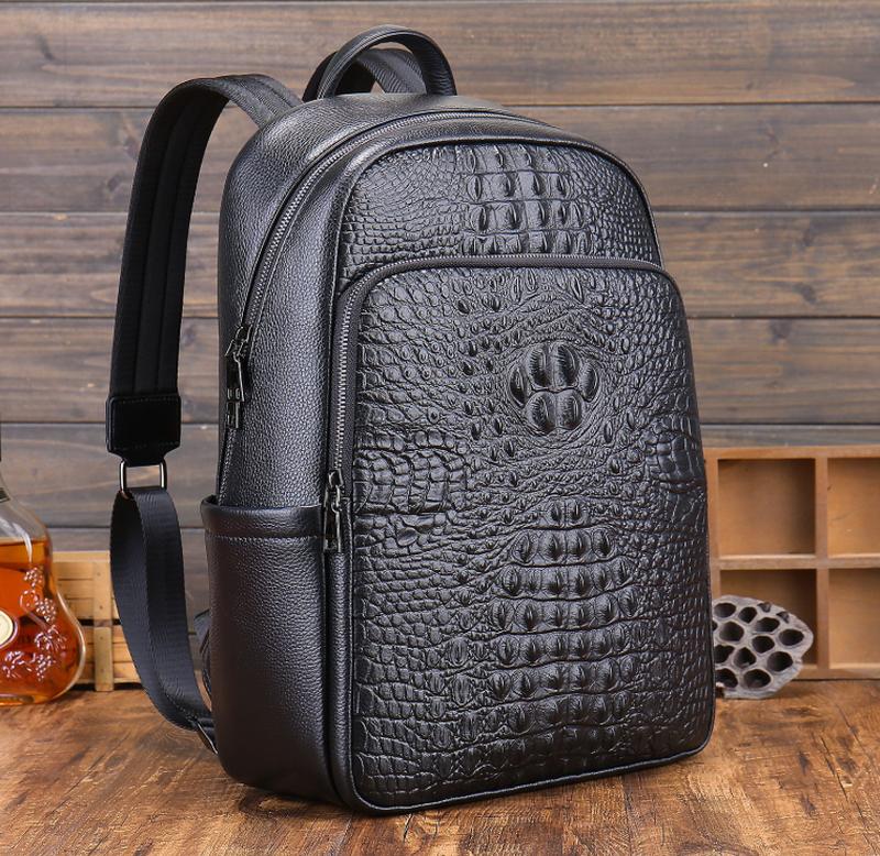 Большой мужской кожаный городской рюкзак с тиснением рептилия крокодил черный