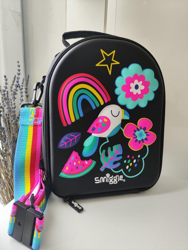 Стан ідеальний, все працює, легенький! На фото показала, що трохи не стерлось написане фломастером ім'я. Ланчбокс виконаний у чорному кольорі з барвистими принтами веселки, екзотичного птаха, квітів та скибки кавуна. Яскравий ремінець додає ще більше кольорів та стилю. Висока якість: Smiggle — відомий бренд, який спеціалізується на шкільних аксесуарах високої якості. Ви можете бути впевнені в надійності та довговічності продукту. Практичність: Ланчбокс має зручну ручку та регульований ремінець для перенесення. Він ідеально підходить для зберігання обіду чи закусок, зберігаючи їх свіжими. Універсальність: Відмінний вибір для школи, пікніків, подорожей або прогулянок.