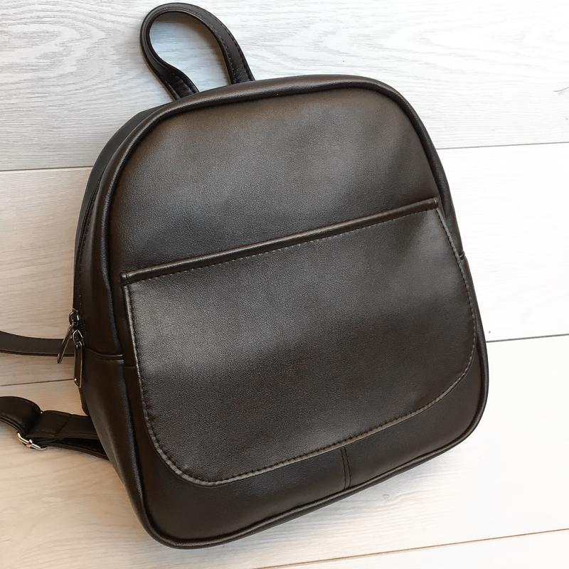 Рюкзак темно-коричневого цвета Материал - качественный кожзаменитель Есть два наружных кармана, на магнитах Внутри на подкладке и карман на молнии Размер 27/26