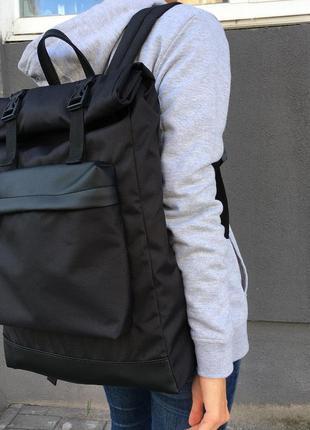 Вместительный рюкзак, выполнен из непромокаемой ткани и кожзаменителя Есть два наружных кармана Внутри на подкладке и карман на молнии В развёрнутом виде высота 61 см, в свернутом 46 см, ширина 33 см