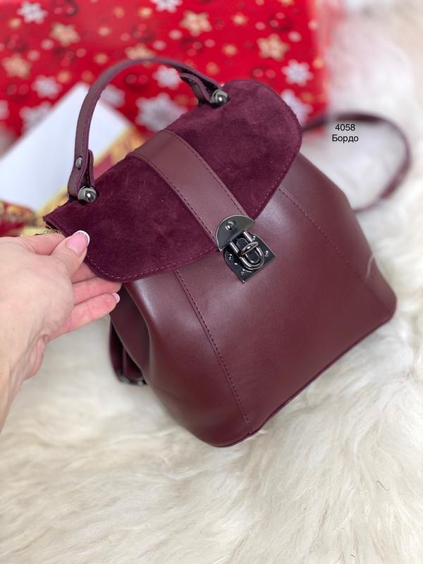Натуральная замша+экокожа Турция 20,5 см ширина по дну. 23 см высота. 13 см глубина. Одно отделение. Внутри карман для телефона и карман на молнии. Цвет: чёрный , пудра , синий , Бордо , металлик , золото , красный