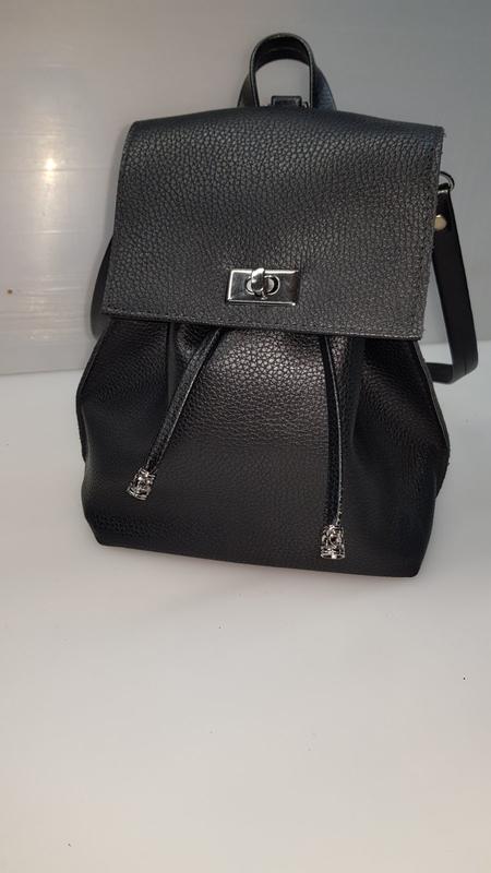 Компактный, вместительный рюкзак. Можно носить как рюкзак, и как сумку. Цвет черный. Есть такие же: шоколадный, темно-синий, белый, золотой. Фурнитура серебряная. Размер: высота 28 см, ширина 19 см, глубина 12 см. Внутри имеет одно отделение и карман.