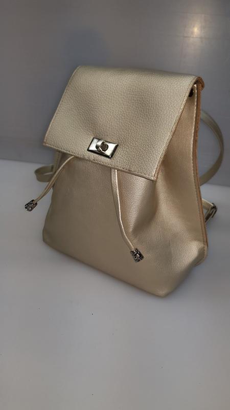Компактный, вместительный рюкзак. Можно носить и как рюкзак, и как сумку. Цвет золотой. Есть такие же: черный, шоколадный, темно-синий, белый. Фурнитура: серебряная. Размер: высота 28 см, ширина 19 см, глубина 12 см. Внутри имеет одно отделение и карман. Магазин "VENZETTI", г. Одесса, ул. Пантелеймоновская, 88а, ТЦ "Александровский", 3 этаж.