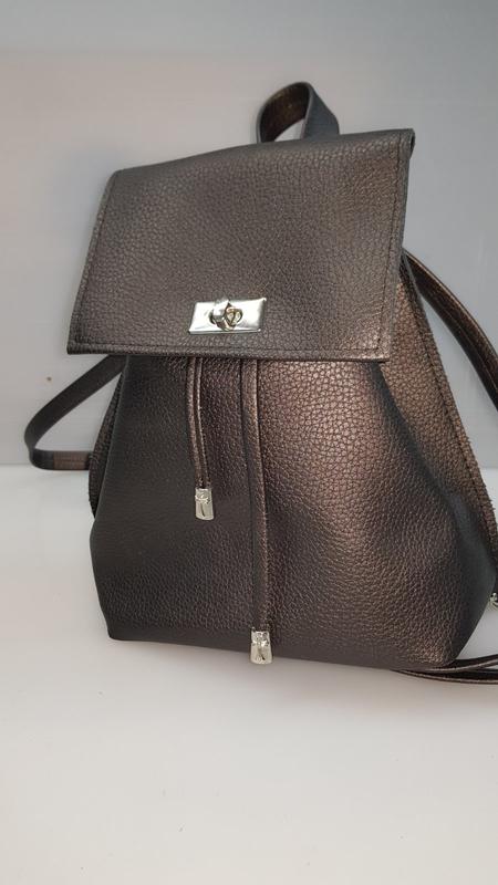 Компактный, вместительный рюкзак. Можно носить и как рюкзак, и как сумку. Цвет шоколадный. Есть такие же: черный, темно-синий, белый, золотой. Фурнитура серебряная. Размер: высота 28 см, ширина 19 см, глубина 12 см. Внутри имеет одно отделение и карман.