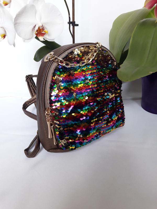 Стильный, яркий рюкзачок с пайетками-перевертвшами для девченок-модниц. Материал: экокожа Размер: 19*21*10 см Внутри одно большое отделение. Приятных Вам покупок и хорошего настроения!