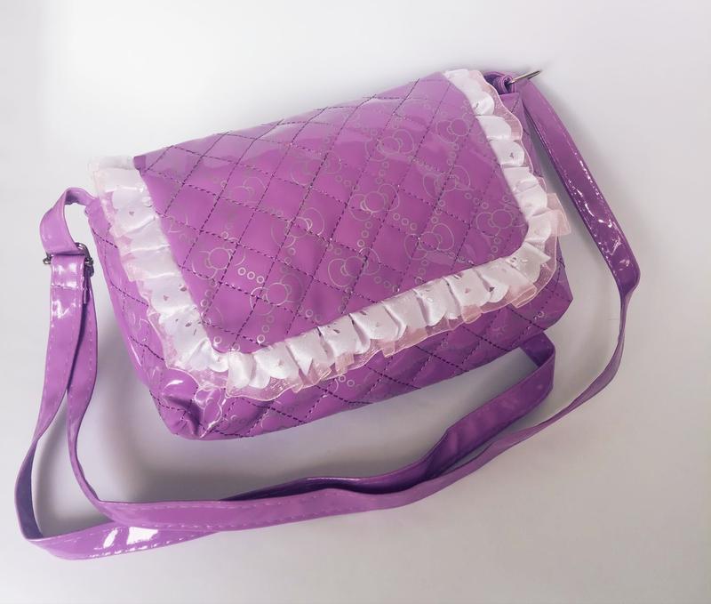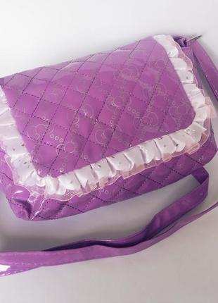 Милая сумочка для девочки, небольшая, но вместительная - можно положить и телефон и ключи и необходимые девчачьи мелочи. Один отдел, закрывается на молнию и магнитную кнопку, внутри текстильная подкладка. Длинный ремешок позволяет носить сумочку через плечо, регулируется по длине. Размер 21*16 см. Отправлю любым уобным для Вас способом.
