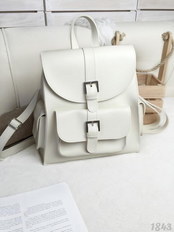 В наличии!! Новый молочный цвет Рюкзачок среднего размера с клапанами Турецкая гладкая качественная эко кожа Рюкзак закрывается на молнию Внутри одно отделение, два кармана, один из которых на молнии С подкладкой Снаружи три кармана на заклепках Шлейки регулируются Фурнитура серебро 28*27*11*см Код 1843 Цвета: беж, белый, черный, черный кроко, капучинно, серый кроко, бордо, молочный