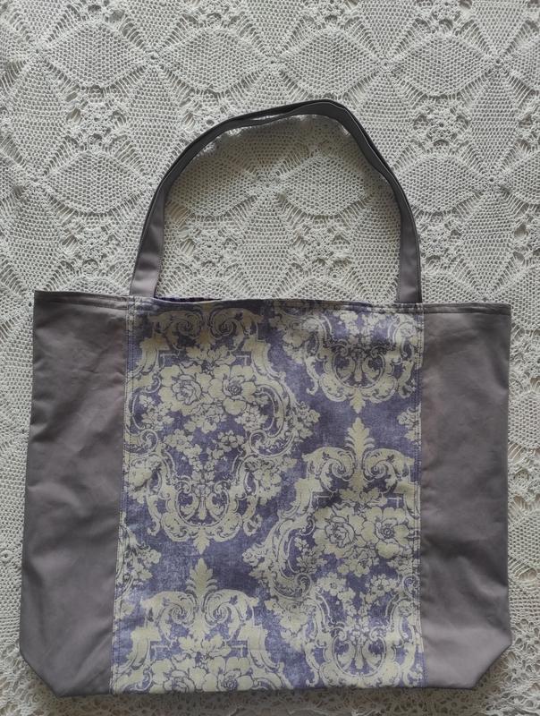 Великий попелястий шопер з натуральної тканини. По середині є вставки з візерунком. Підкладка, ручки дозволяють носити на плечі. Розміри 45*50*10