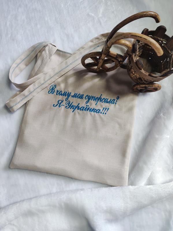 Шопер з машинною вишивкою,надпис може бути іншим,на підкладці, всередині вмістка кишеня, оздоблення мереживо льон.