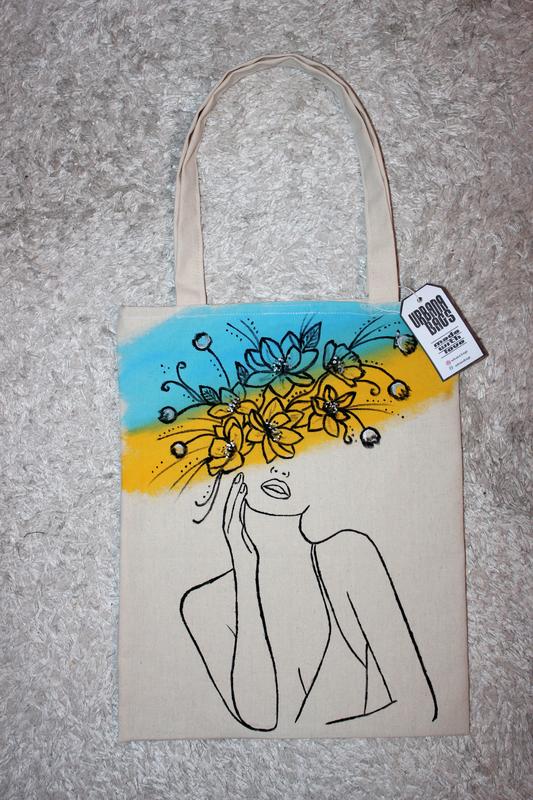 Простора текстильна сумка ручної роботи. Малюнок виконано стійкою акриловою фарбою для тканин. Матеріал – бавовна. Розмір сумки – 42 х 34 см, ручки – 60 см. Всередині – підкладка з кишенею. Застібка-липучка. Рекомендовано ручне прання.
