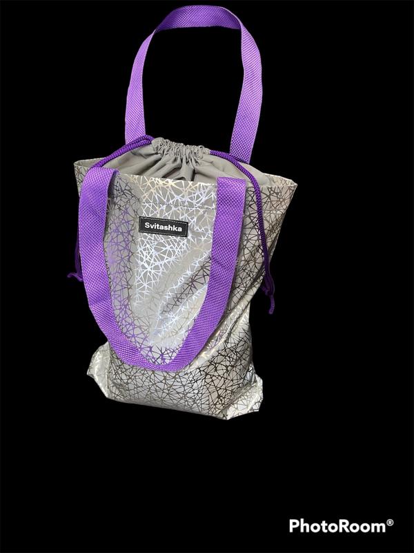 Новинка на завязках Светоотражающий шоппер теперь еще лучше будет хранить Ваши вещи от дождя и потерь. размер шоппера стандартный 40*33 ручки 58см. Удобно и стильно, а главное безопасно с Светашкой