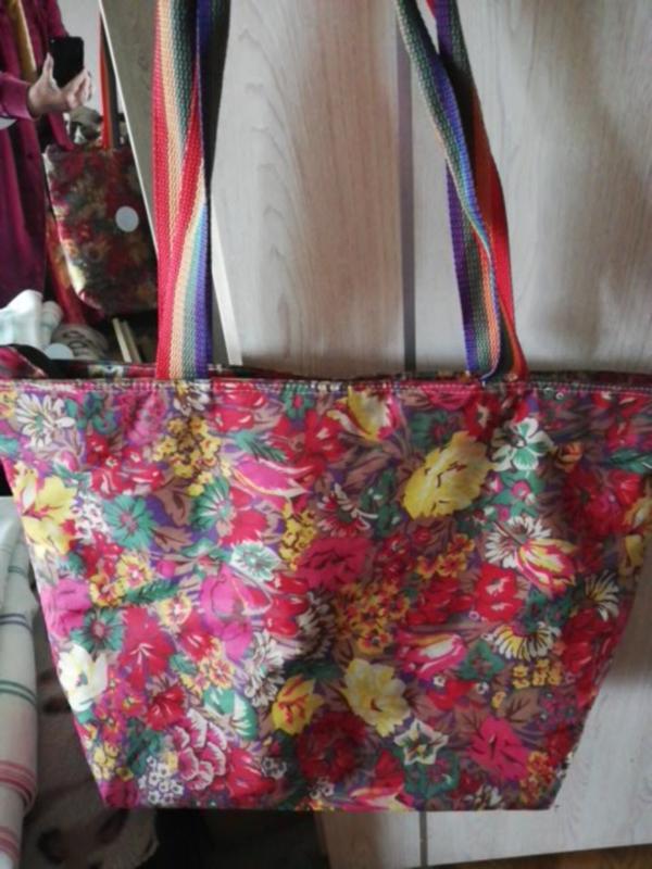 Яскрава сумка. Вологостійкий матеріал. 32*47*15 (висота, ширина, глибина) Застібка блискавка. Одна кишенька на блискавці. Підкладка - тканина.