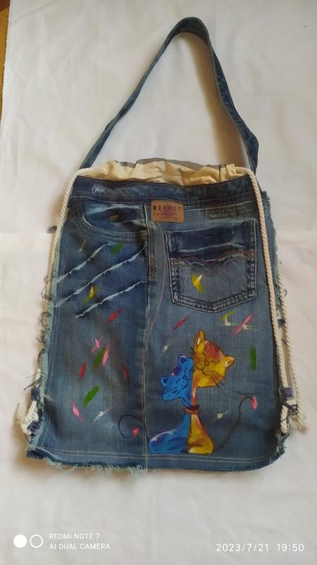 Джинсовая сумка шопер из джинсовой ткани с ручной росписью . Внутри на подкладке ,застёжка - шнур затяжка, одна длинная ручка , наружные карманы без застёжки, можно носить как рюкзак и через плечо.