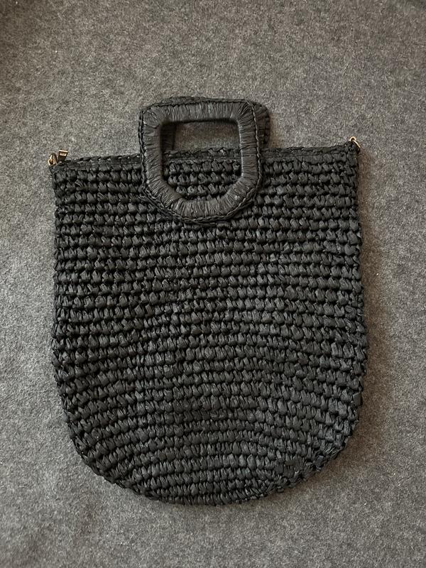 Сумка-мішок або шопер з м‘якої рогожки. Чорного кольору, застібається на блискавку. Має дві жорсткі ручки (пластик обтягнутий рогожкою) і довгий коричневий плечовий ремінець. Стильна і актуальна річ. Виробник — Україна Розміри: 39х35 см