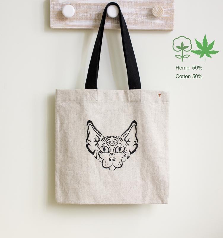 Эко сумка шоппер. ткань смесь конопли и хлопка с собственным рисунком кота