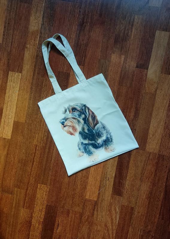 Шоппер, еко-сумка бежевого кольору із малюнком собаки (точніше, схожий на Дратхаар). Розмір сумки 38*41 см. Ручки довжиною 60 см і шириною 3 см. Стан: помітно на фото. Був нюанс згори, закрила біркою, теж є на останньому фото. Випрати. Без дірок тощо.