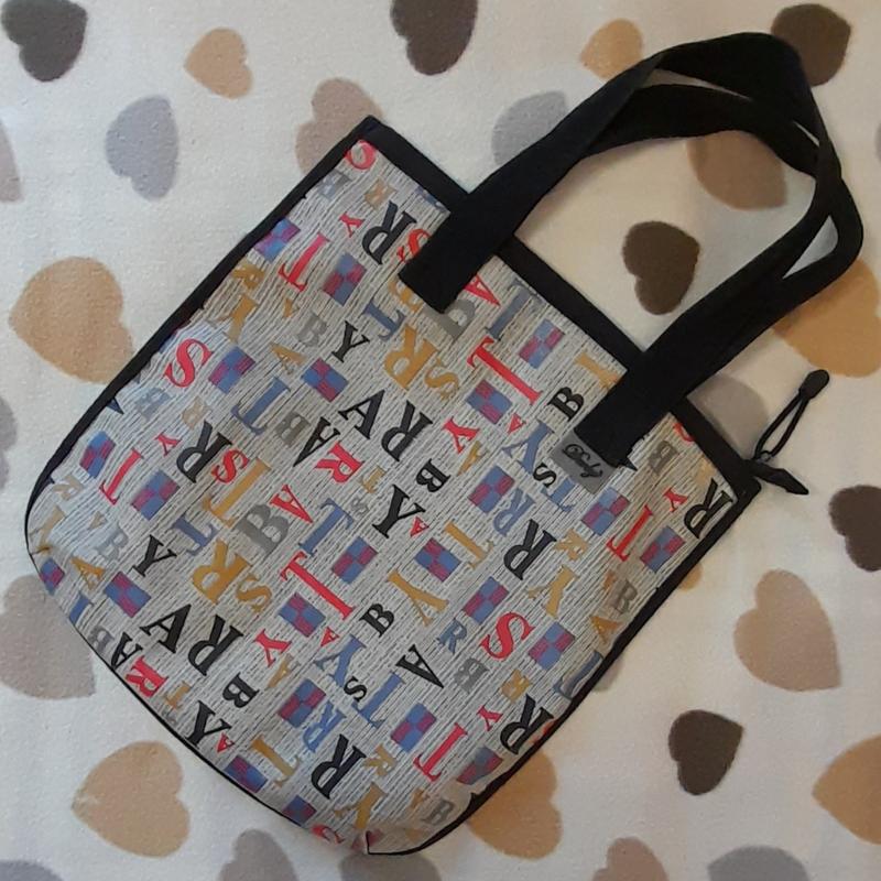 Удобная сумка-шоппер Derby. Можно использовать весь день и для покупок. У сумки две ручки. Можно носить на плече и в руках. Передняя стенка сумки полиуретан (типа клеенки), материал, принтованный английскими буквами. Одно большое отделение закрывается на молнию. Имеет подкладку и один кармашек на молнии в середине. Размер: высота - 40 см, ширина - 39 см, ручки - 55 см. Цвет: черный, разноцветный. Материал: хлопок, полиуретан (клеенка). При запросе дам больше деталей.