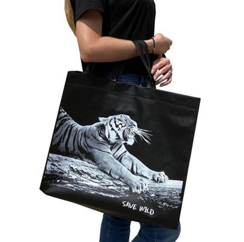ЕКО СУМКА"ТИГР". КОРОТКА РУЧКА Тип тканини Спанбонд Колір Чорний Кількість відділень 1 Тип застібки Блискавка Максимальна вага 25 кг Висота 385 мм Ширина 320 мм Глибина 120 мм Довжина ручок 400 мм щільність 90 г/м2