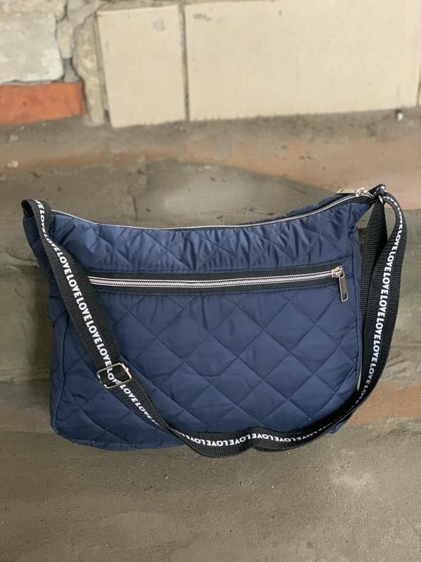 Стеганая сумка из плащевки; Два отделения на молнии, длинный регулируемый ремень с надписью; Размер длина :30; ширина :6.5; высота:22 см;