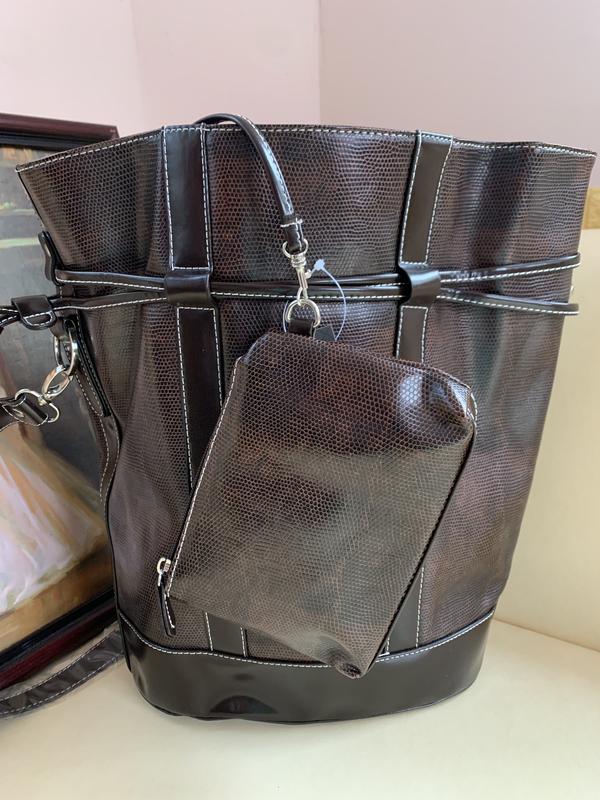 Елегантна сумка шопер коричневого кольору зроблена з якісного матеріалу. Зверху без кишень , всередині одна кишеня зі змійкою, одна без,загальне відділення без блискавки, але затягується на шнурівку..висота 36,ширина 35,дно 15, довжина ручки регулюється , 95 см.