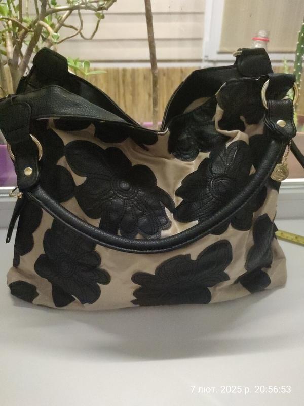 Сумка текстиль с нашитыми цветами.Цветы из кожи PU.Размер 30*40*8 см.Застежка на магнитную кнопку.Внутри маленькие карманчики.Сумка не имеет явных дефектов,в очень красивом состоянии, практично новая!Местка и качественная.