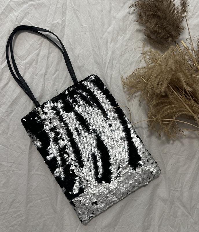 Стильная удобная сумка шоппер небольшого размера с двусторонними пайетками/ В середине одно отделение с малыми кармашками/ Ручки средней высоты/ Застегивается на молнию, не кожа -качественный заменитель/ Высота 39 см/ Ширина 30 см: Высота ручек 29 см/ Продается без возврата