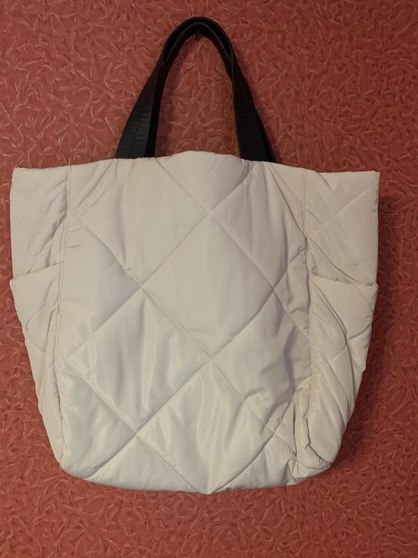 Объемный шоппер с боковыми карманами, внутри еще есть потайной карманчик на молнии для мелочей, цвет молочный, внутренняя подкладка и ручки шоколадные, очень классный и стильный, новый
